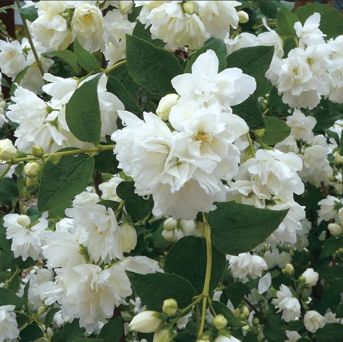 Чубушник, также известный как садовый жасмин, представляет собой листопадный кустарник с множеством побегов и поверхностной корневой системой. Высота растения варьируется от 0,8 до 2 метров. Этот сорт отличается неприхотливостью и высокой морозоустойчивостью. Цветки белого или кремового оттенка, диаметром от 2 до 5 см, могут быть простыми, махровыми или полумахровыми. Цветение начинается в конце мая и продолжается до конца июля. Растение начинает цвести на третий год после посадки. Садовый жасмин устойчив к вредителям и болезням, хотя иногда может поражаться тлей.